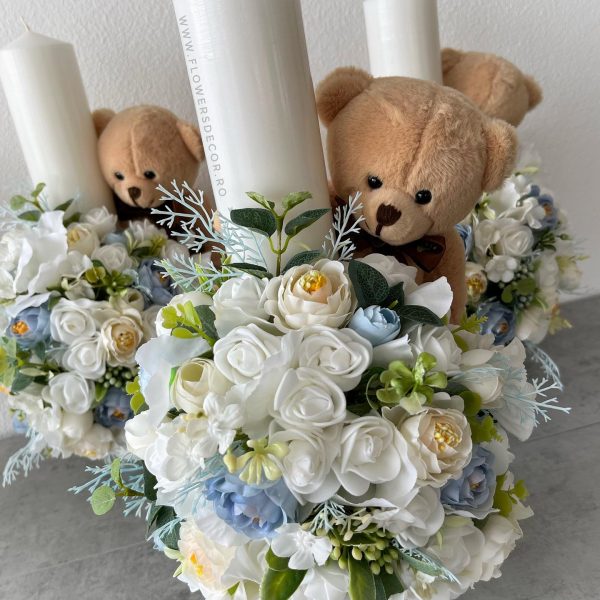 Lumanare tip fagure pentru botez decorata cu flori de bumbac si ursulet, ivory – baby blue