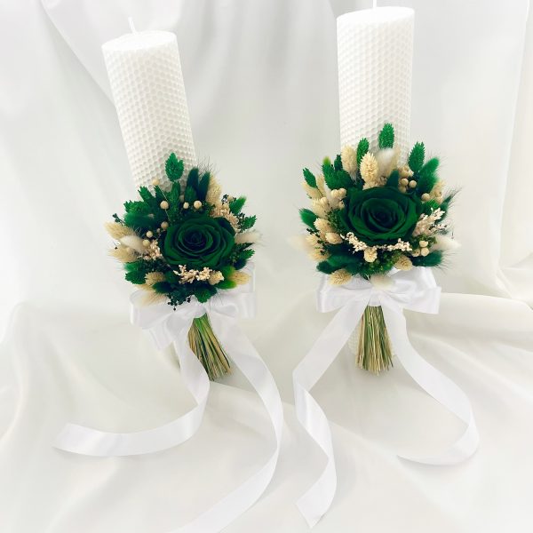 Set 2 Lumanari personalizate cununie religioasa cu flori de matase, alb-verde
