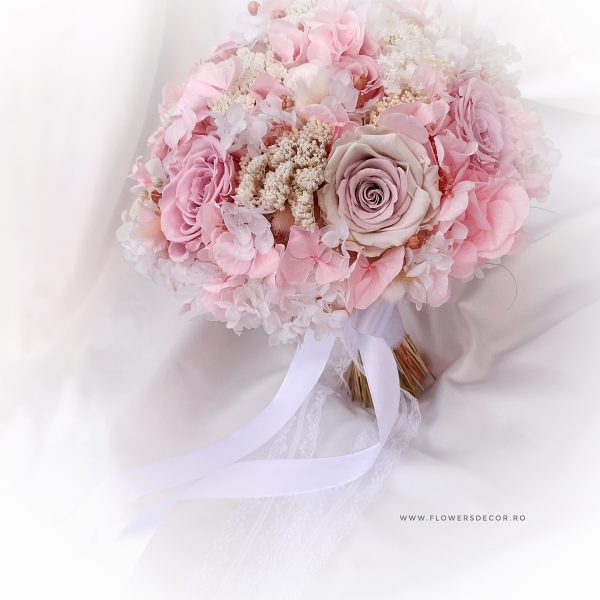 • Buchet mireasa cu trandafiri, minirosa si hortensie criogenata, roz-alb 680.00 lei