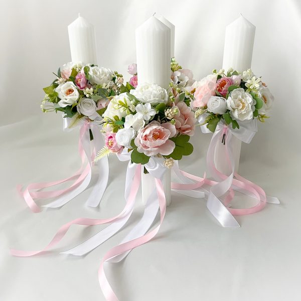 • Set 2 Lumanari canelate cununie religioasa cu flori de matase, alb-roz 420.00 lei