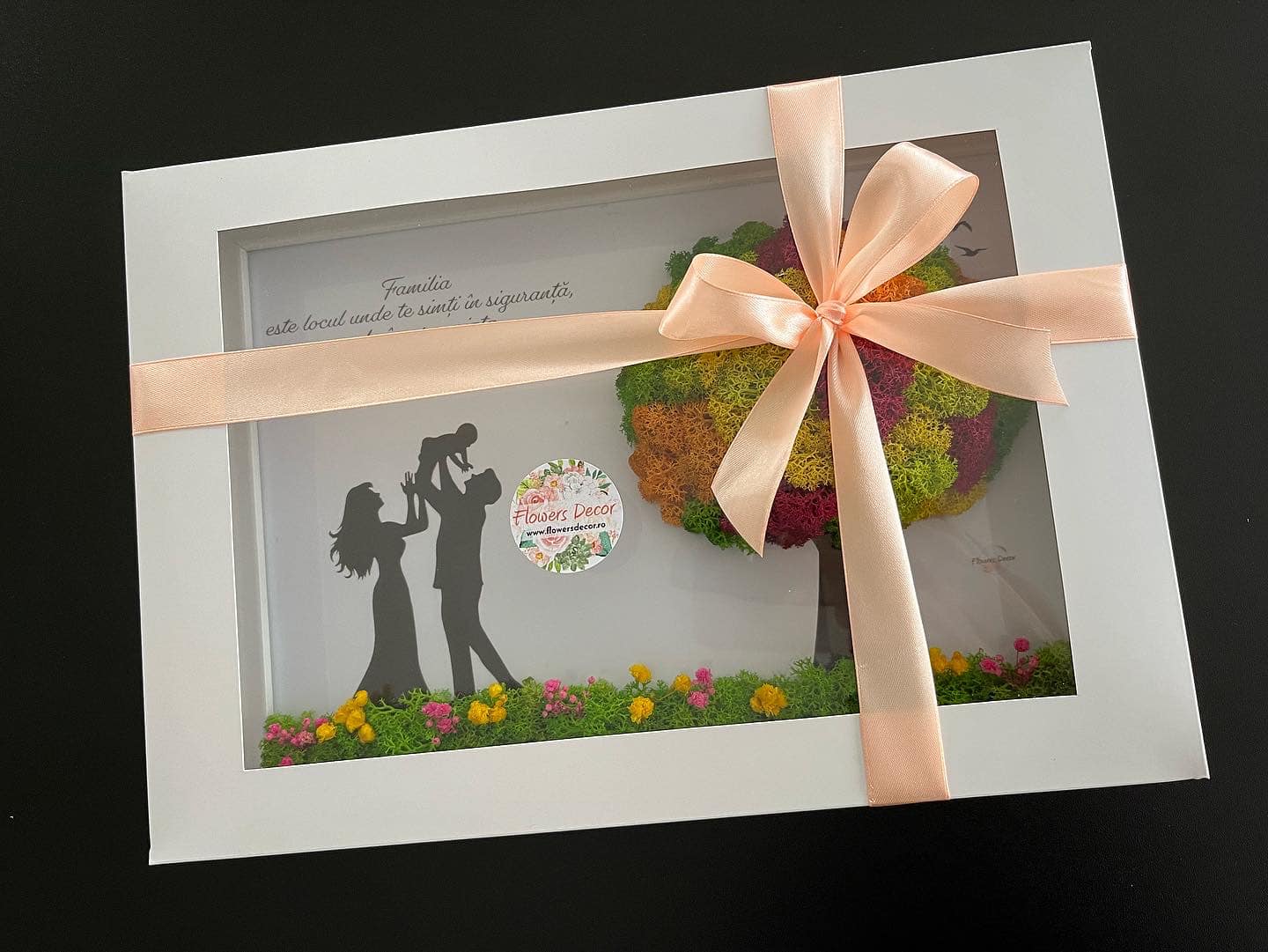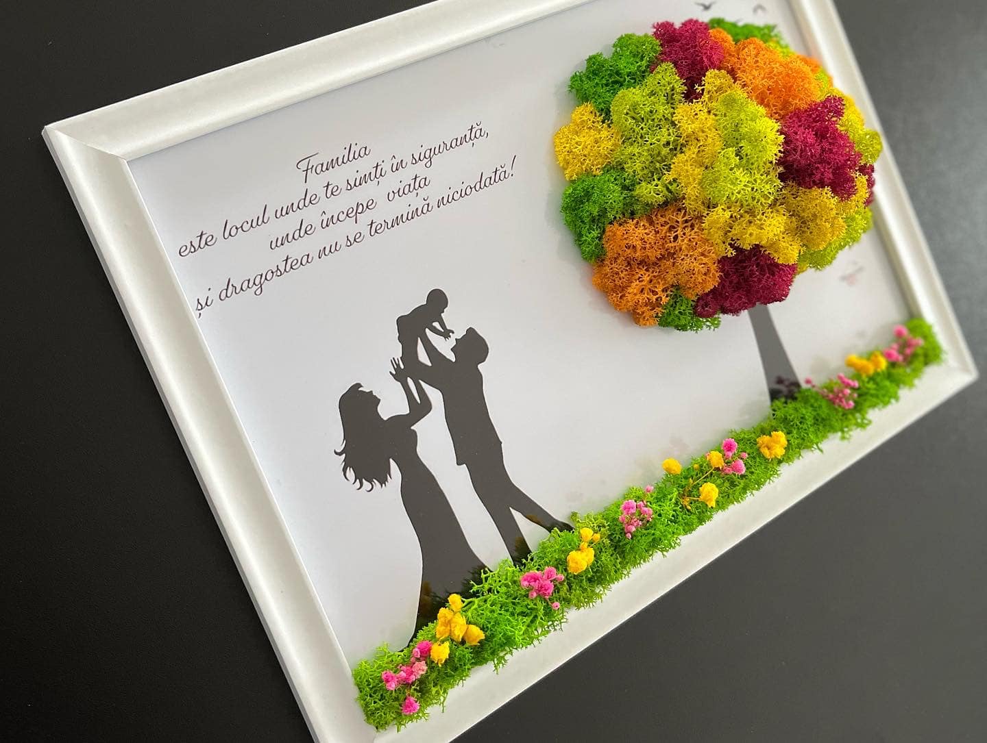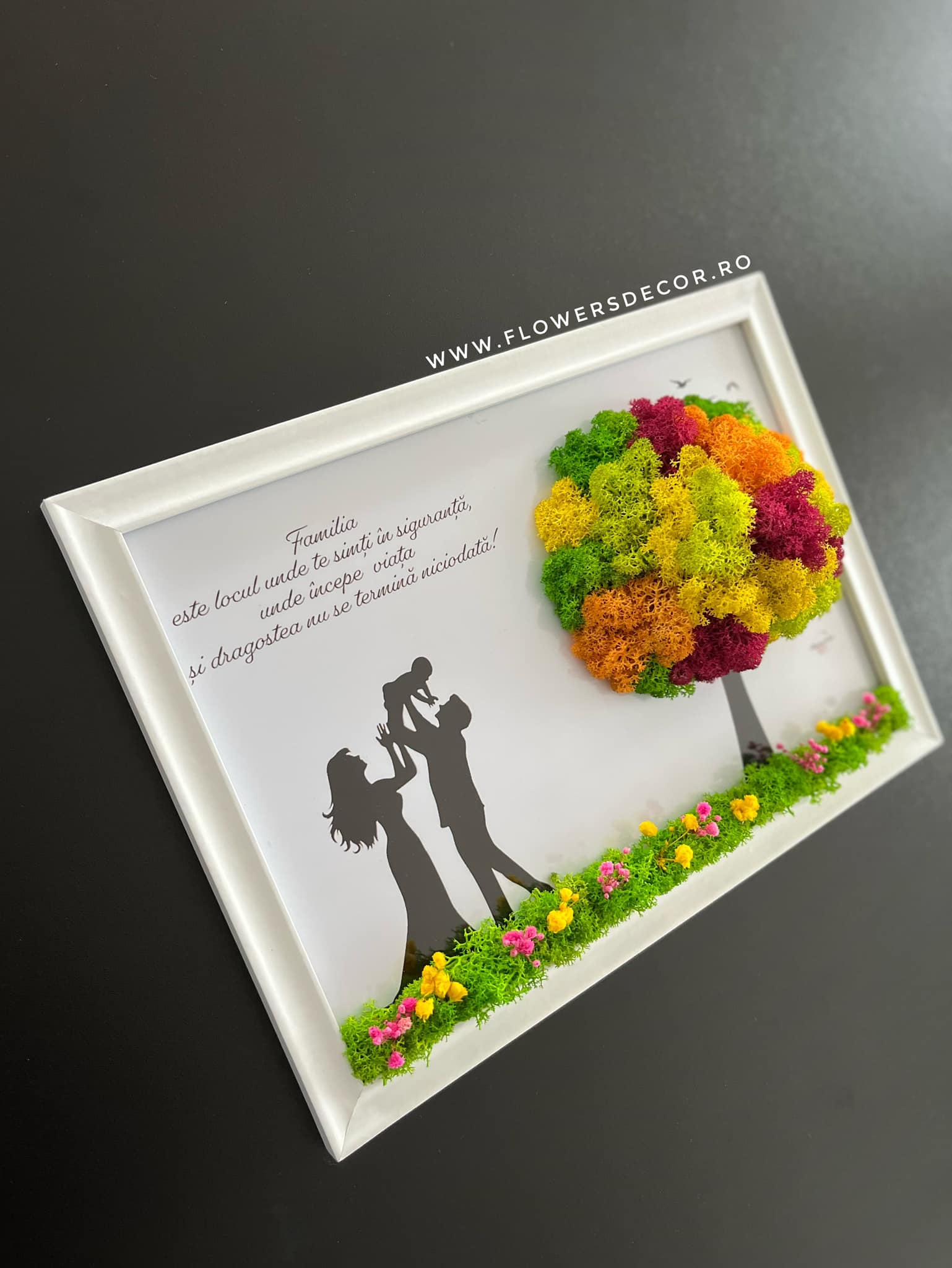 Rama cu mix licheni colorati stabilizati, flori uscate si mesaj personalizat – Familia formata din mama, bebe si tata.