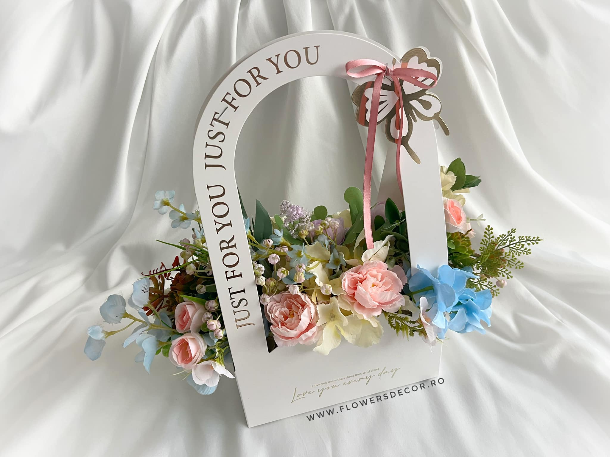 Aranjament cu flori de matase Just For You in nuante pastel , blue-roz pal