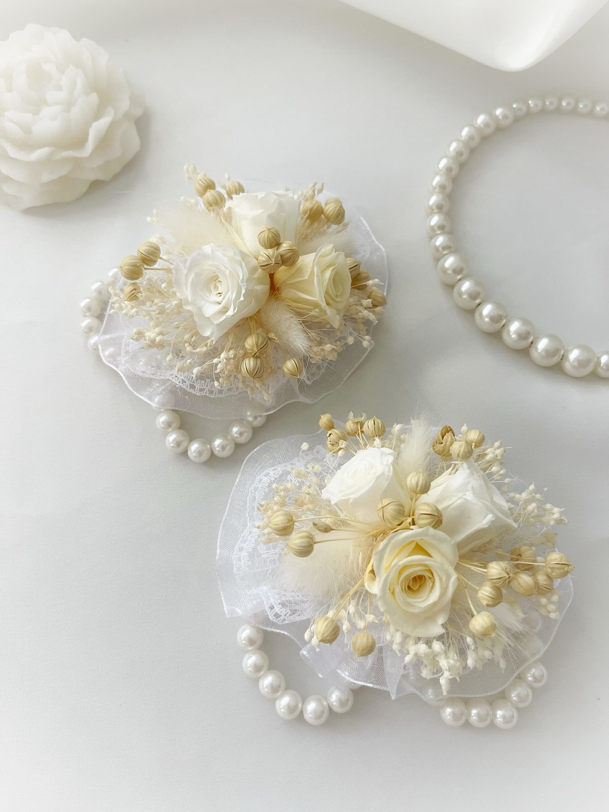 Bratari decorate cu mini rosa si plante criogenate pentru domnisoare onoare/nase, alb-crem