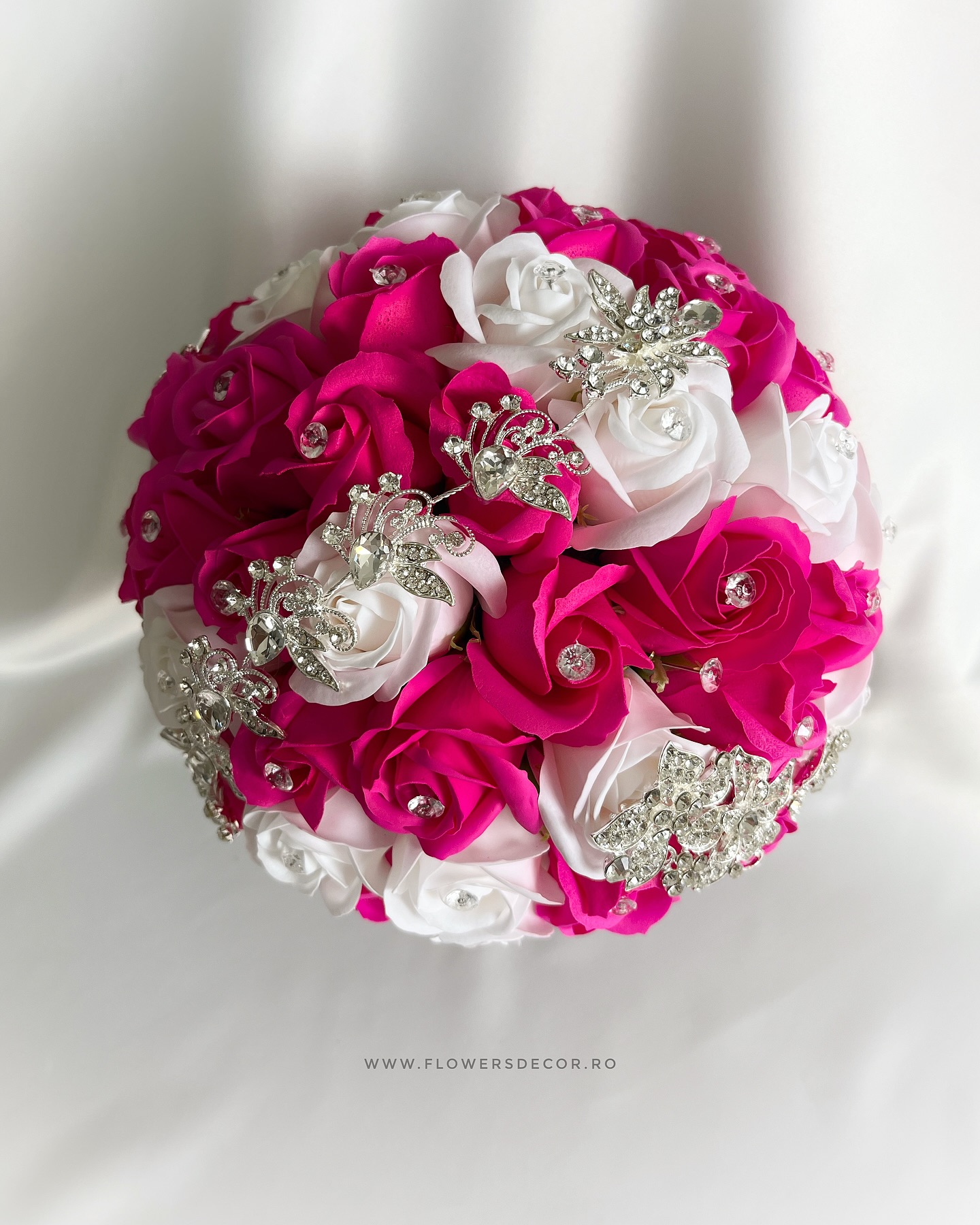 Buchet mireasa cu trandafiri de sapun, strasuri si cristale, alb-fucsia