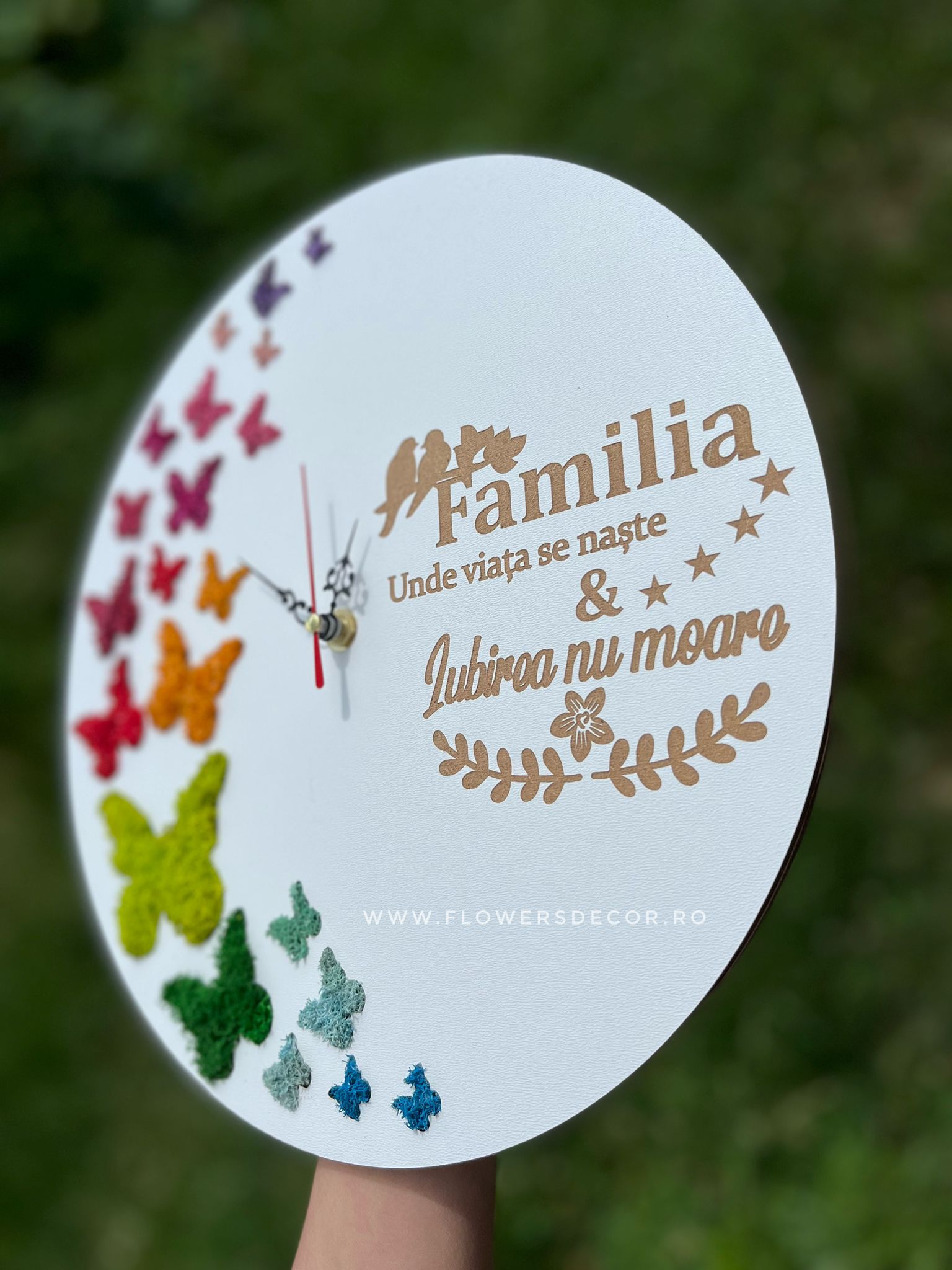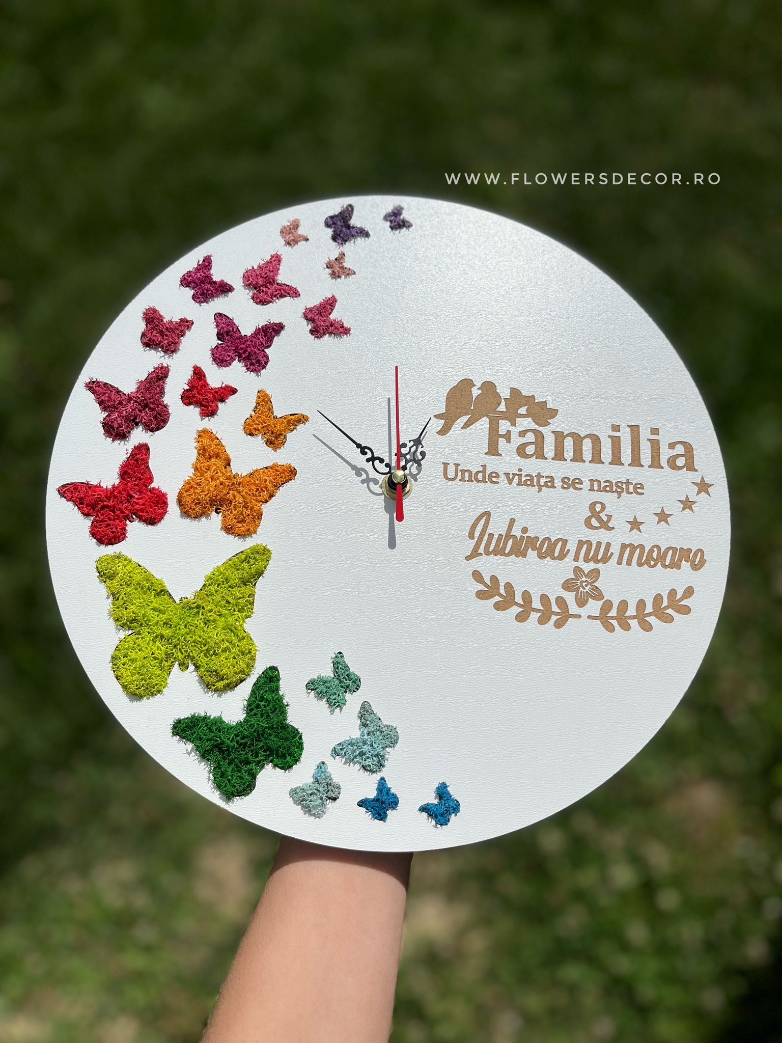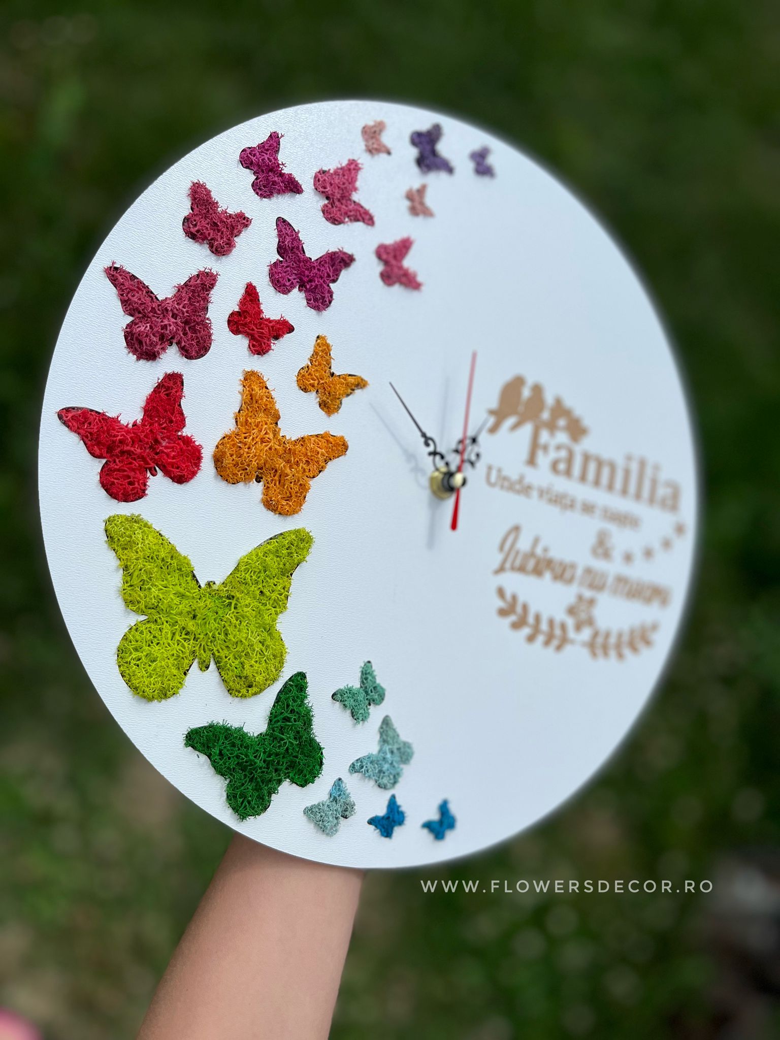 Ceas de perete cu fluturi si mesaj personalizat – „FAMILIA – Unde viata se naste & iubirea nu moare!”  decorat cu licheni stabilizati, ce va aduce natura in casa dumneavostra.