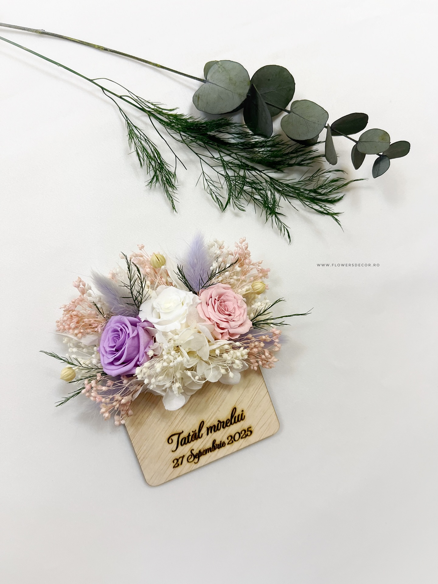 Cocarda de buzunar cu mini rosa si plante uscate, mov-alb-roz
