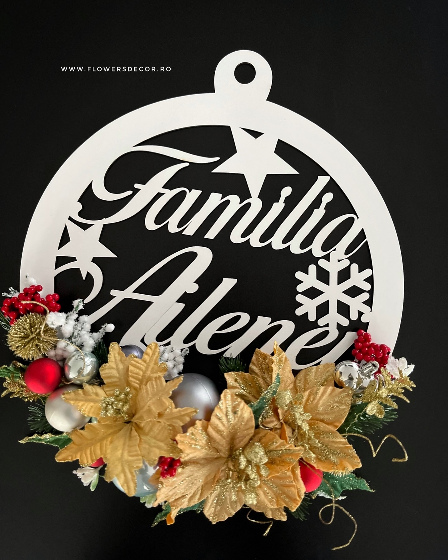 Coronita Craciun pentru usa in nuante de auriu, personalizata cu numele de familie, 30 cm