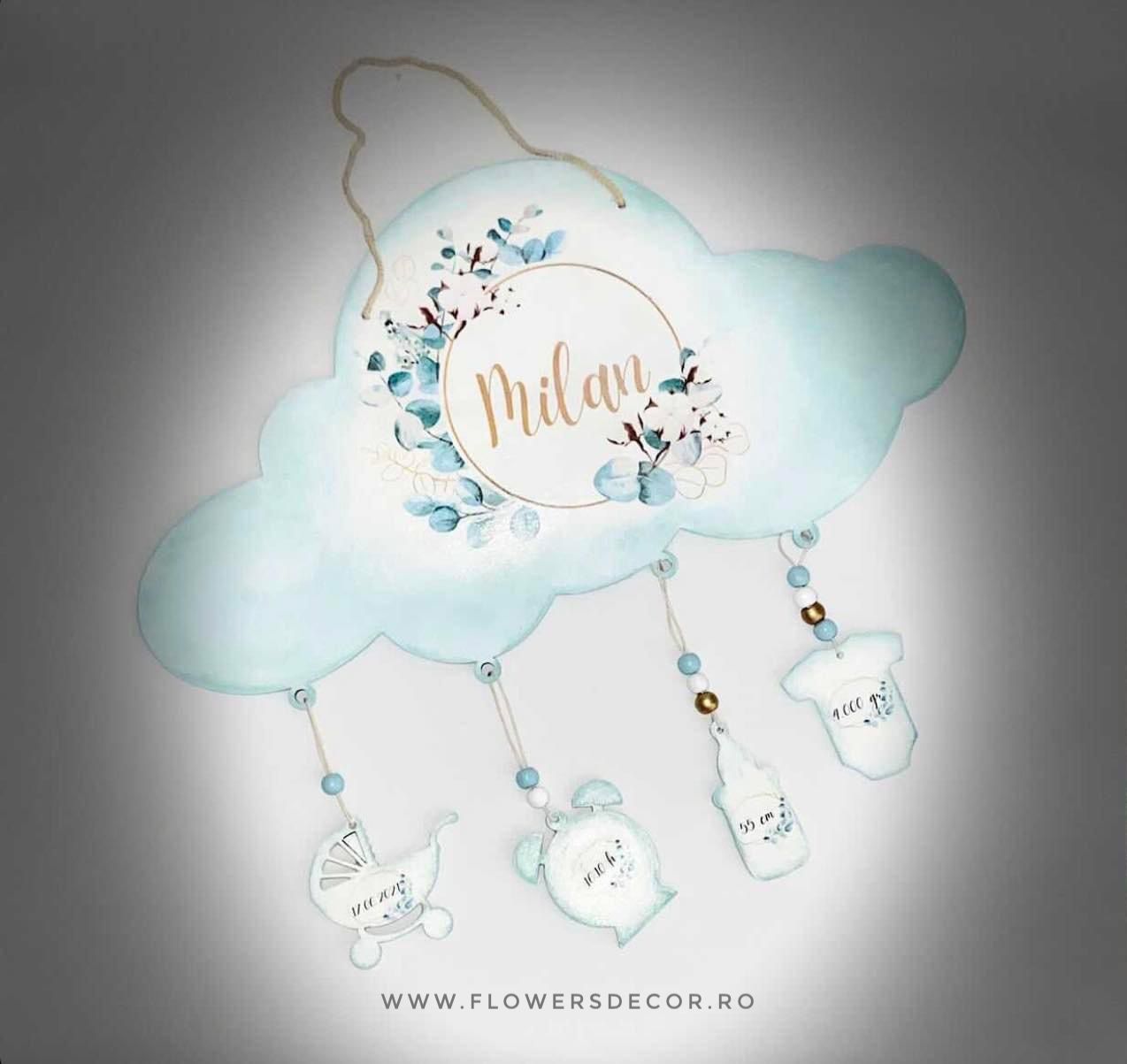 Fii primul care scrii o recenzie pentru „Decoratiune cu nume pentru camera copilului in forma de norisor, eucalipt”