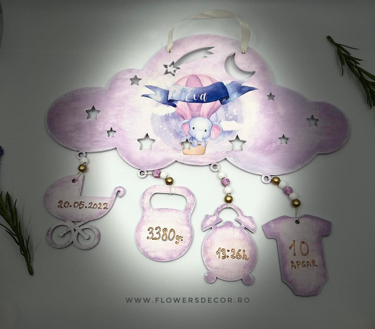 Decoratiunea contine numele copilului, data si ora nasterii precum si greutatea si lungimea de la nastere, astfel incat devine un dar minunat din partea bunicilor, unchilor, nasilor sau a prietenilor. De altfel, este un cadou minunat pentru orice varsta, pentru ca se poate personaliza nu doar cu nume ci si cu mesaj.