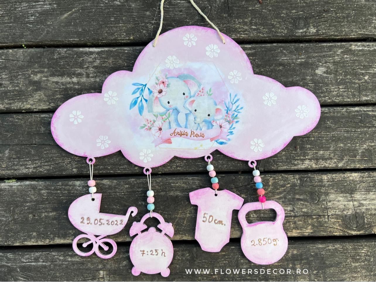 Decoratiunea contine numele copilului, data si ora nasterii precum si greutatea si lungimea de la nastere, astfel incat devine un dar minunat din partea bunicilor, unchilor, nasilor sau a prietenilor. De altfel, este un cadou minunat pentru orice varsta, pentru ca se poate personaliza nu doar cu nume ci si cu mesaj.