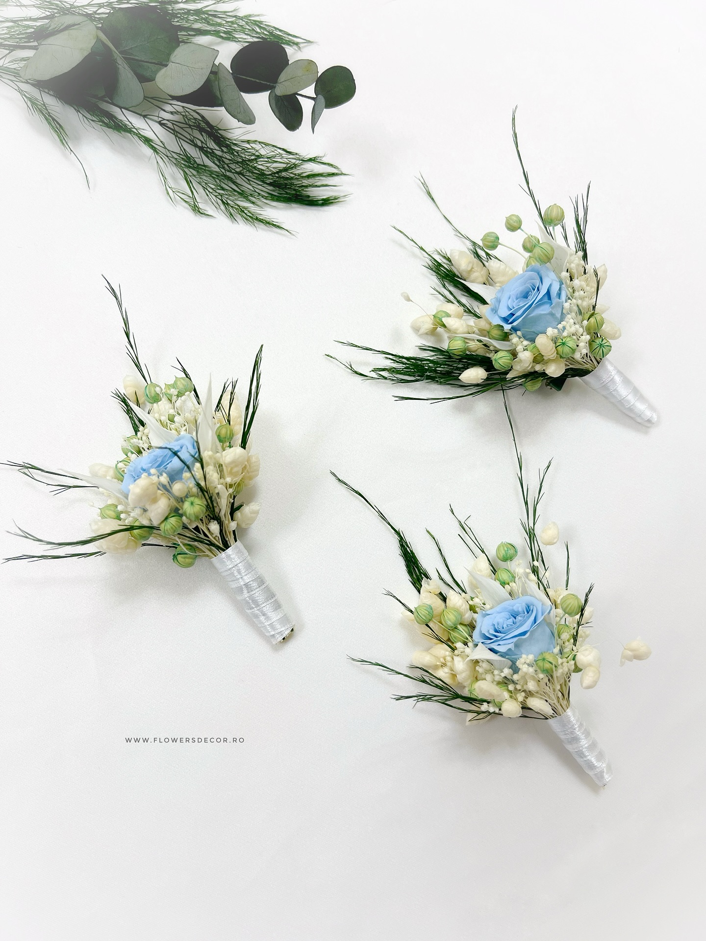 Floare de pus in piept cu mini rosa criogenat si plante/ flori naturale stabilizate, realizat special pentru a completa tinuta eleganta a mirelui, nasilor sau a  invitatilor de la nunta.