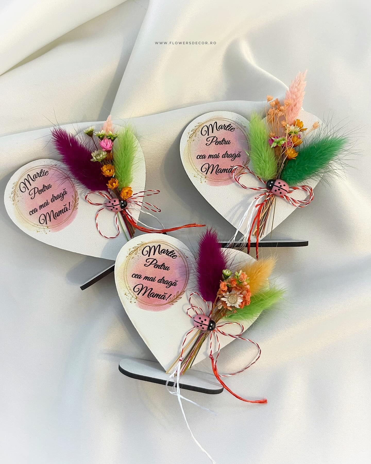 Martisoare inimioare cu flori uscate diverse culori cu mesaj imprimat pentru mama