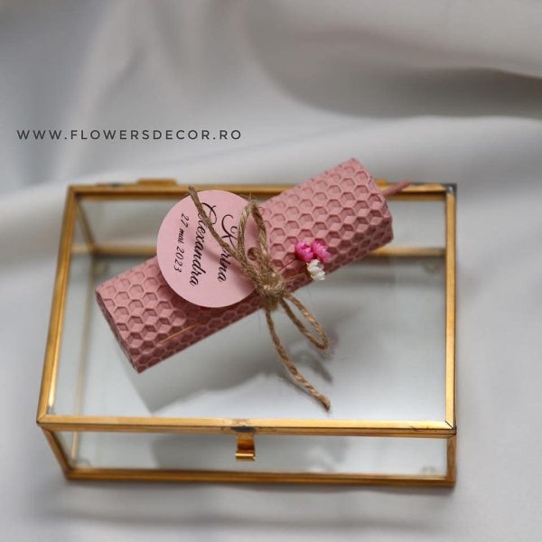 Fiecare marturie vine ambalata individual cu funda si contine eticheta rotunda cu numele mirilor/copilului si/sau data de nastere/data evenimentului, (dupa caz).