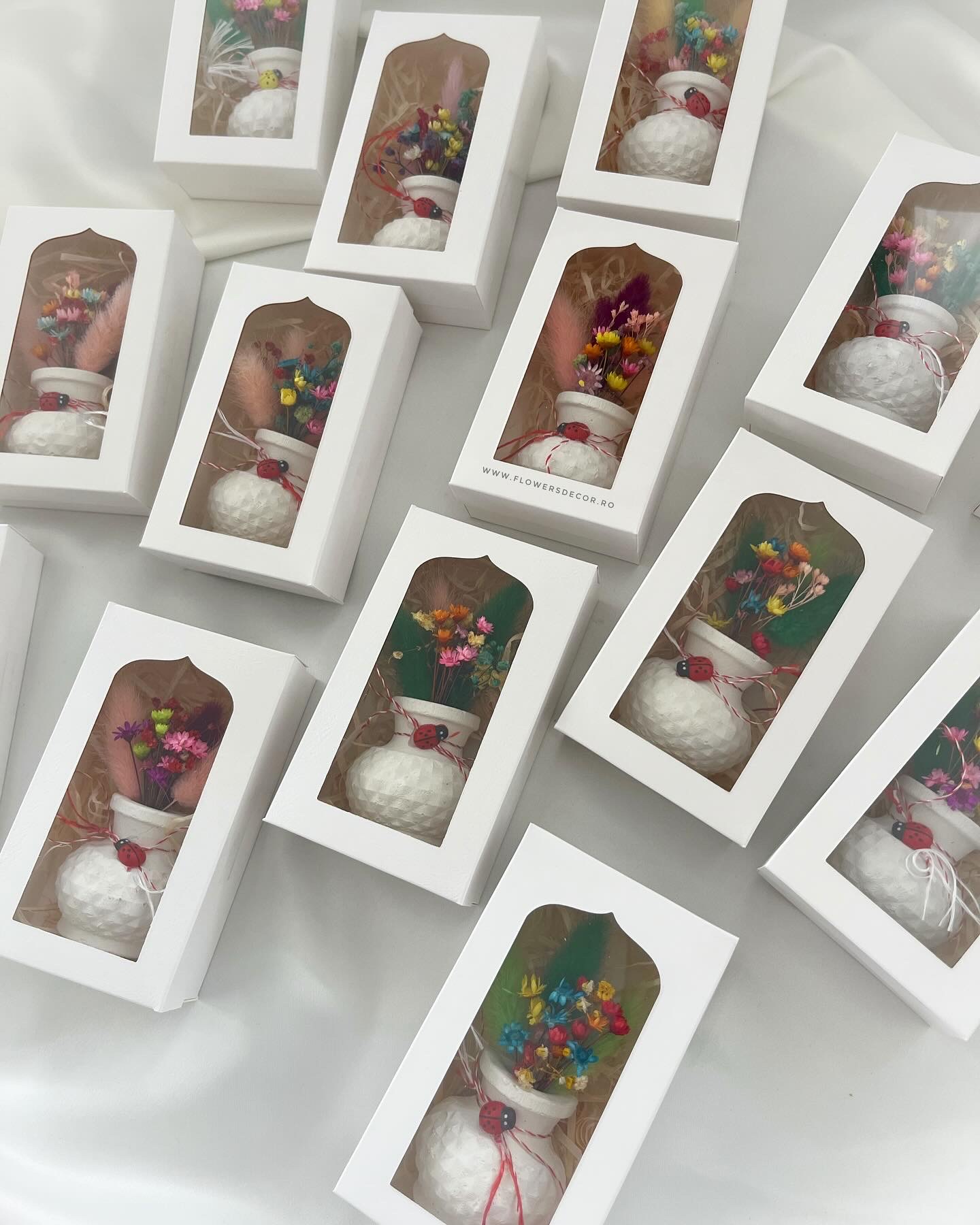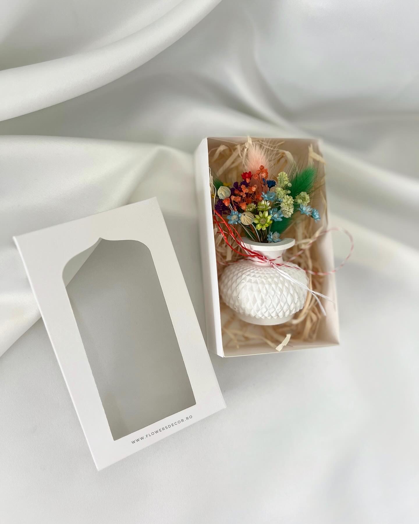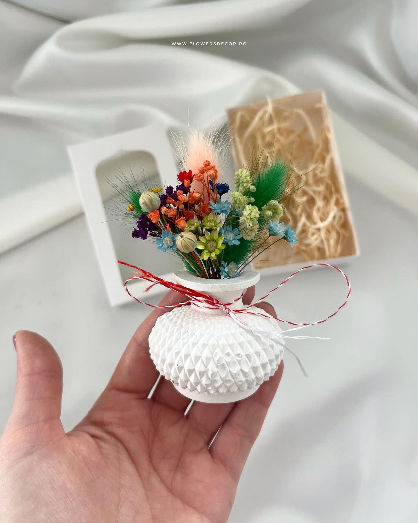 Mini vaza realizata din praf ceramic in nuanta alb, decorata cu flori uscate.