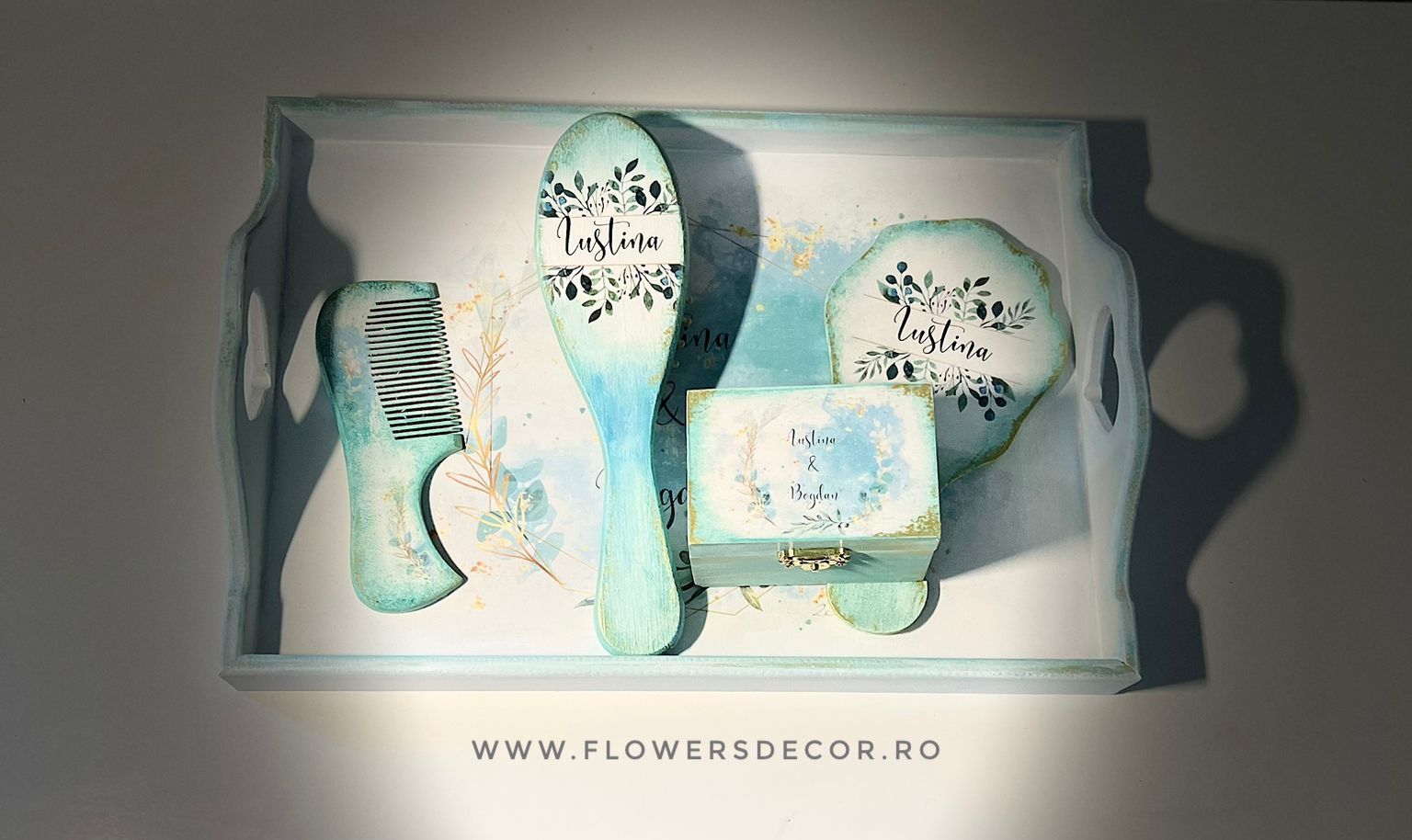 Setul pentru gatitul miresei/mirelui e este realizat 100% manual in cadrul atelierului Flowers Decor folosind tehnica transferului. Setul se realizeaza pe comanda cu numele miresei/mirelui, data eveniment (zi/luna/an) si/sau text.