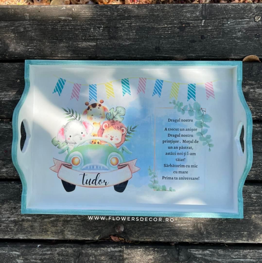 Setul pentru taierea motului este realizat 100% manual in cadrul atelierului Flowers Decor folosind tehnica transferului. Setul de mot se realizeaza pe comanda cu numele copilului, data eveniment (zi/luna/an) si/sau text.