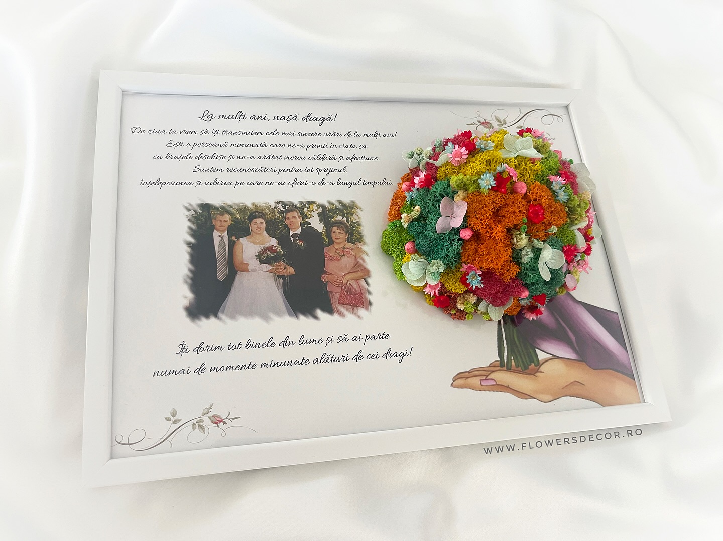 Tablou aniversare – Buchet realizat din licheni stabilizati, decorat cu plante stabilizate, personalizat cu mesaj pentru nasa