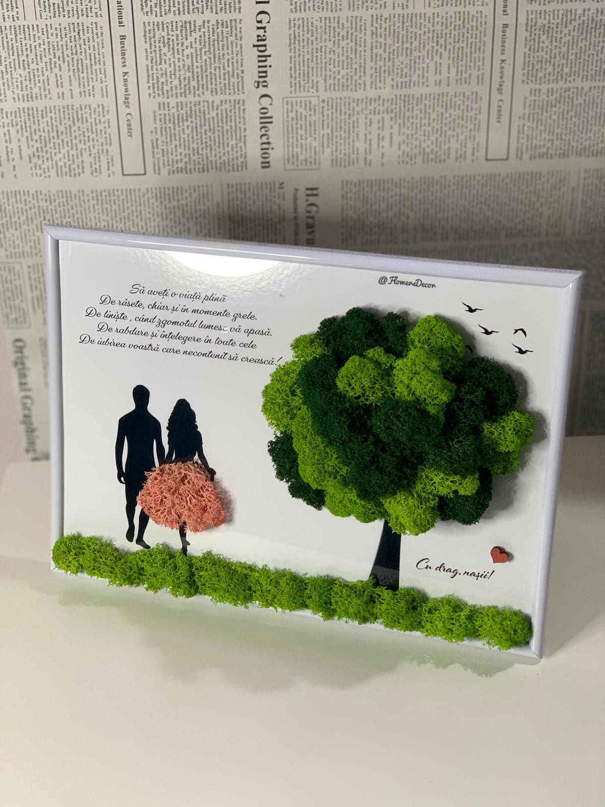 Rama cu licheni – personalizata; Culoare rama: Alb; Format A4; Tablourile cu licheni sunt un cadou potrivit pentru orice ocazie. Sunt realizate manual, iar fiecare produs in parte este unic.