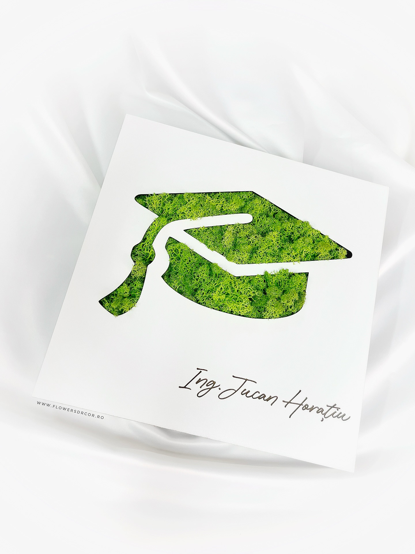 Rama tip caseta cu licheni stabilizati – personalizat cu numele inginerului absolvent.